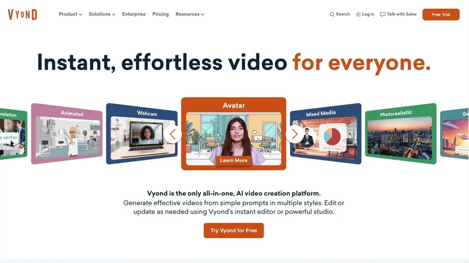 By harnessing the power of AI, Vyond is making video creation instant and effortless for everyone. Features like Text to Image and Video to Action use AI to help you add the visual and character movement you want. Instant Video Translation quickly localizes your video in any of 70+ languages. And the enhanced power of Vyond Go now dynamically generates prop visuals into your video.