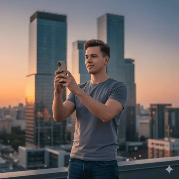 یک عکس حرفهای از یک دختر یا پسر در حال عکاسی با موبایل ایجاد کن که در پسزمینه آن، شهری مدرن در هنگام غروب با نورهای ملایم دیده میشود؛ پسزمینه و رنگ لباسها ساده و یکدست باشد تا بتوان بعداً بهراحتی رنگها، حالوهوا و بکگراند را تغییر و بازطراحی کرد؛ ترکیببندی تصویر متعادل، نور طبیعی و جزئیات واضح در چهره و لباس حفظ شود تا برای ویرایش و ریمیکسهای مختلف تبلیغاتی و محتوایی مناسب باشد.
