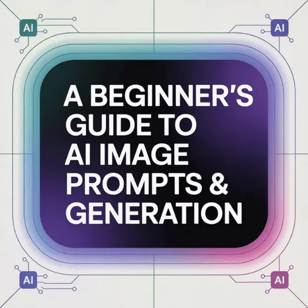 یک پوستر تبلیغاتی برای معرفی یک دوره آنلاین «آموزش ساخت تصویر با هوش مصنوعی» طراحی کن که تمرکز اصلی آن روی متن واضح و خوانا باشد؛ در مرکز پوستر یک کادر رنگی با گوشههای گرد قرار بگیرد و داخل آن، با تایپوگرافی فارسی بزرگ و شفاف، جمله « A Beginner’s Guide to AI Image Prompts & Generation» نوشته شود.