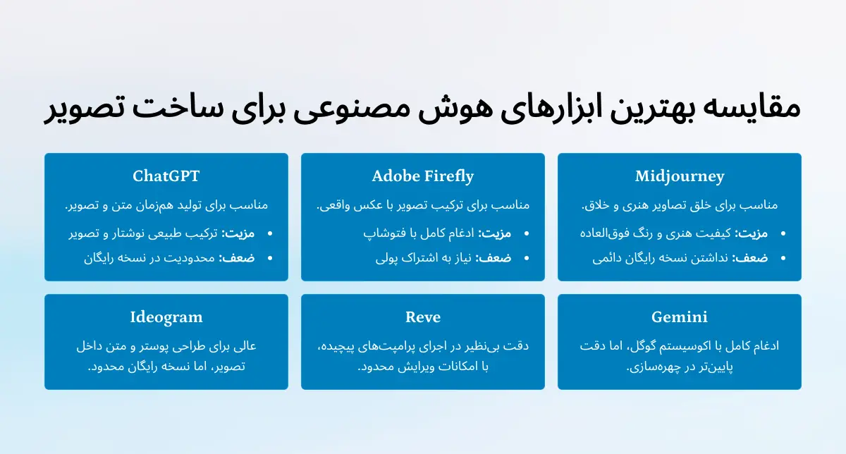 | ChatGPT | تولید همزمان متن و تصویر | ترکیب طبیعی بین نوشتار و تصویر در یک محیط واحد | محدودیت در نسخه رایگان و کنترل کمتر روی جزئیات |