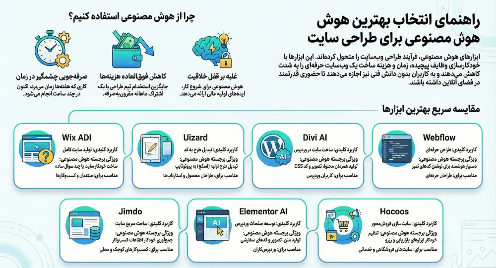 | Wix ADI | تولید سایت کامل | ساخت خودکار سایت با پرسیدن سوال | مبتدیان و صاحبان کسبوکار |