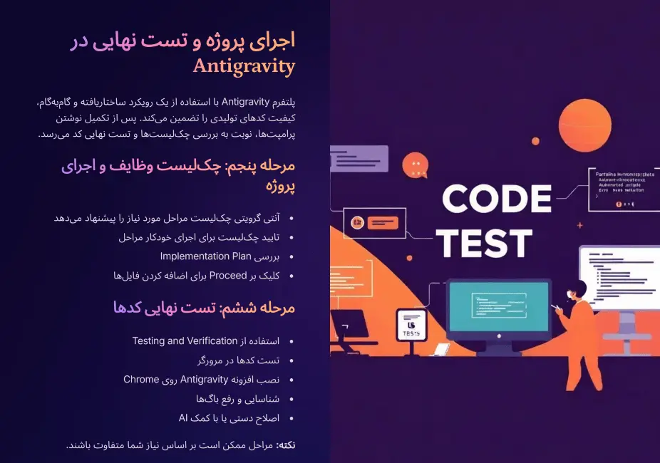 پس از نهایی‌کردن کدهای نوشته‌شده می‌توانید روی مرورگر خود از آن‌ها تست بگیرید. در این بخش آیتم جدیدی با عنوان Testing and Verification به شما نمایش داده می‌شود. می‌توانید روی گزینه Setup کلیک کنید تا از فایل‌های دایرکتوری روی مرورگر تست بگیرید. البته پیش از آن باید افزونه هوش مصنوعی آنتی گرویتی گوگل روی کروم نصب شده باشد. با بررسی نتیجه نهایی می‌توانید باگ‌های موجود را شناسایی کنید و به‌طور دستی یا با کمک هوش مصنوعی آن‌ها را برطرف نمایید.