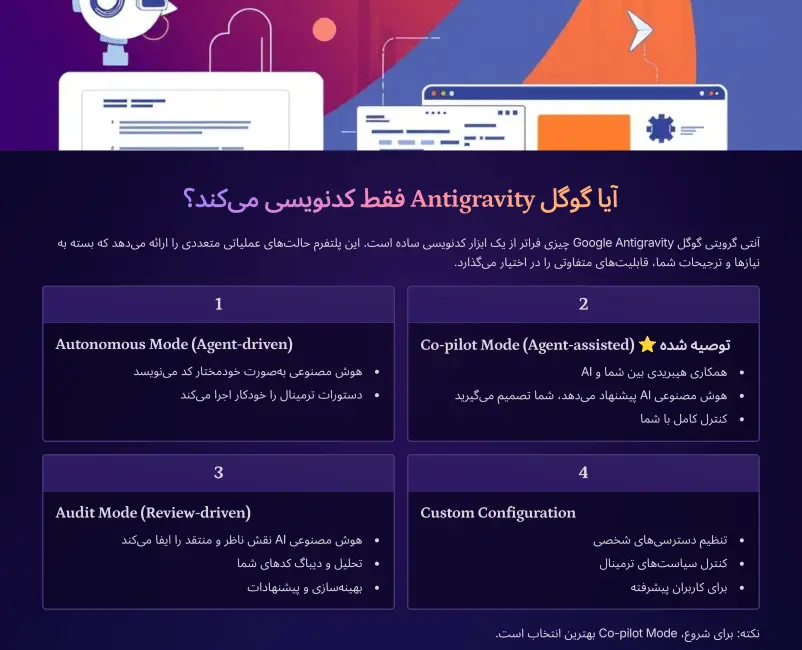 • Review-driven development که حالت بازرسی (Audit Mode) است. در اینجا هوش مصنوعی آنتی گرویتی گوگل فقط نقش ناظر و منتقد را ایفا می‌کند تا کدهای نوشته شده توسط شما را تحلیل، دیباگ و بهینه‌سازی کند.