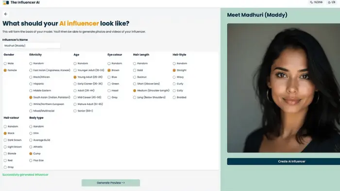 - اگر تصویر ساختهشده مطابق چیزی است که انتظار داشتید، روی Create AI Influencer کلیک کنید تا آواتار مجازی شما ساخته شود.