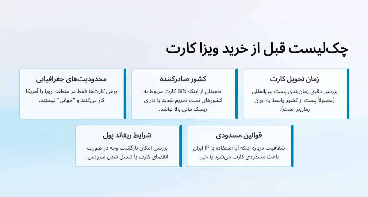 - همچنین برای کاربرانی که خرید ویزا کارت فیزیکی دلاری انجام دادهاند، توجه به قوانین FATF و تفاوتهای بانکی کشور صادرکننده ضروری است.