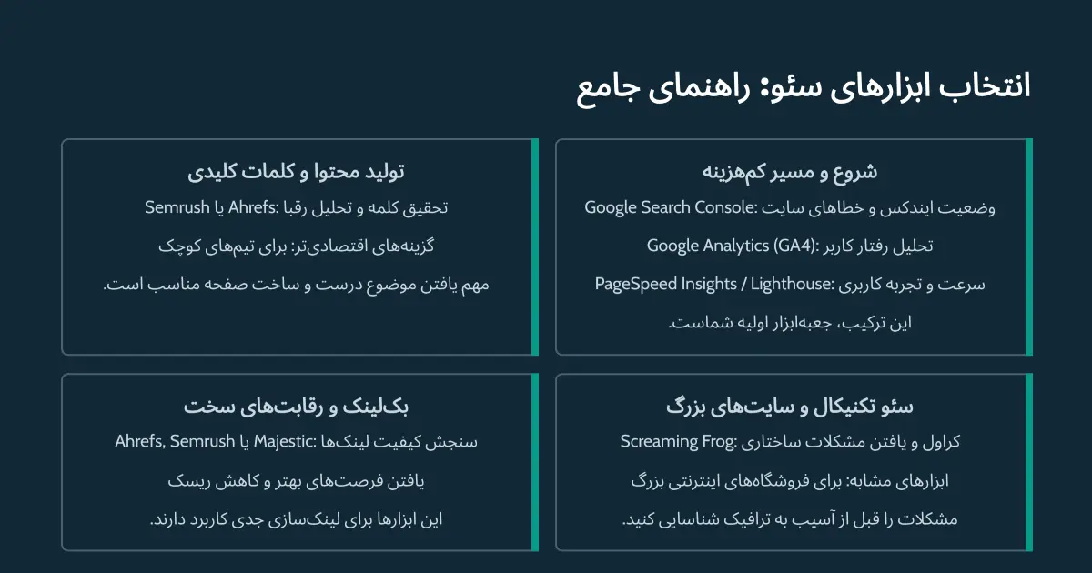 البته بدون ابزار هم میشود سئو کرد، اما اغلب نتیجه این میشود که یا دیر متوجه مشکل میشوید، یا نمیدانید کدام اقدام واقعاً اثر داشته است. ابزار خوب، دست راست سئوکار است چون کارهای وقتگیر را سبک میکند و به شما کمک میکند تا روی ابزار مهم تمرکز کنید.