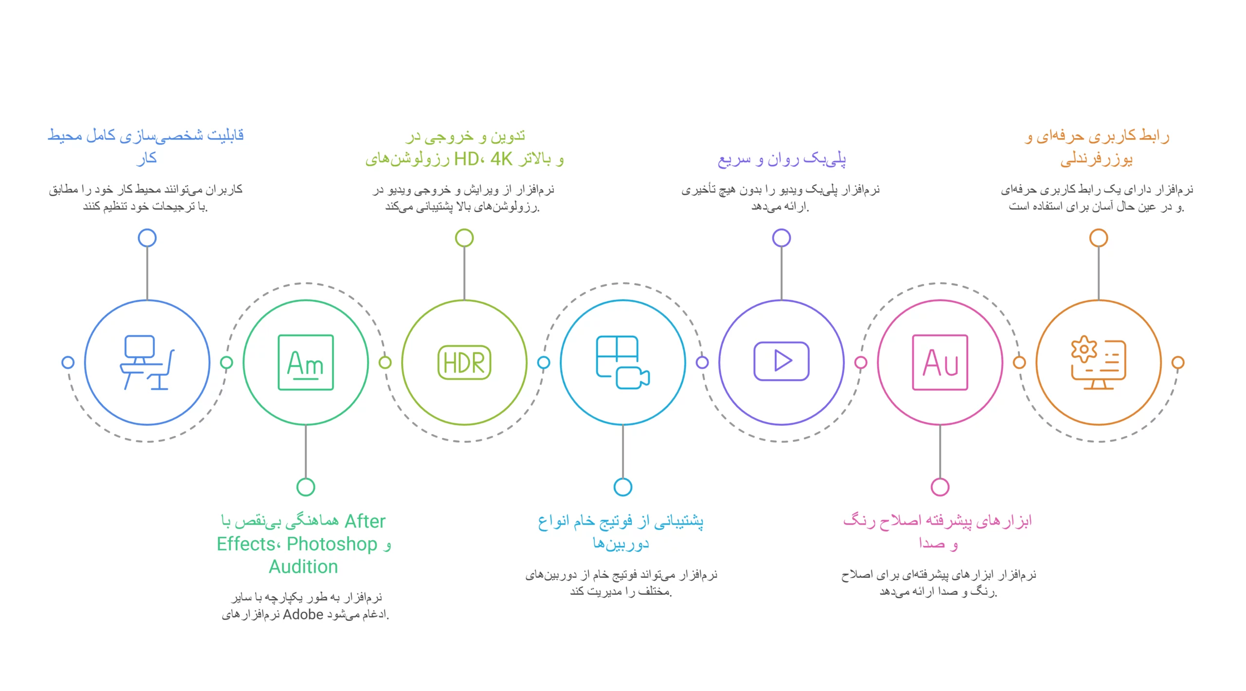• شامل Premiere، After Effects، Photoshop و سایر ابزار های حرفه‌ ای