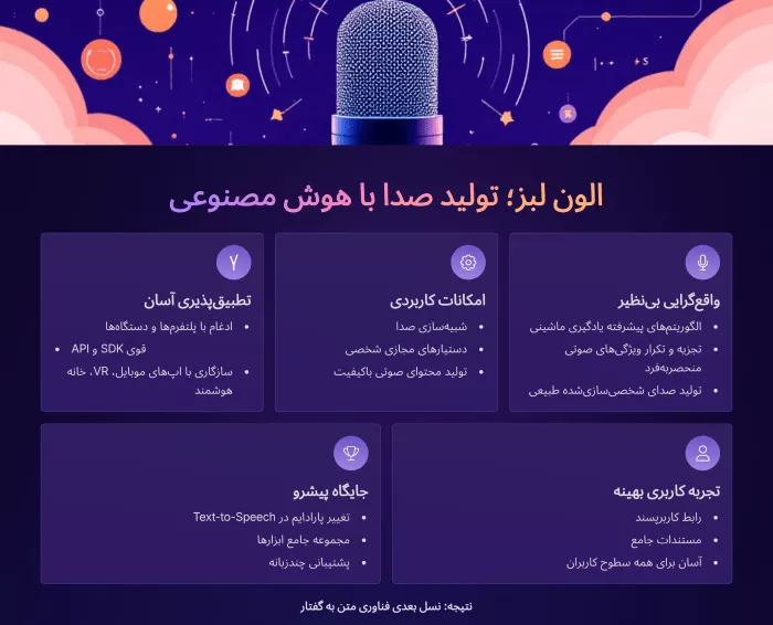 • با واقع‌گرایی بی‌نظیر، گزینه‌های سفارشی‌سازی، پشتیبانی چند زبانه و یکپارچه‌سازی، در خط مقدم نسل بعدی فناوری متن به گفتار قرار دارد و به کاربران این امکان را می‌دهد تا ایده‌های خود را با صداهای جذاب و واقعی زنده کنند.