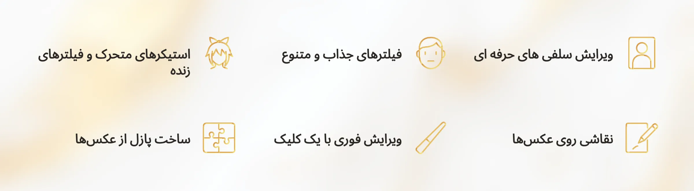- فیلتر ها و استیکر های متحرک: دوربین سلفی در این برنامه فیلتر هایی چون پرتره، آرایش، لیفت صورت، درشت کردن چشم ها، تغییر مدل مو، اضافه کردن ریش و سبیل و استیکر های متحرک برای عکس های سرگرم کننده را دارد.