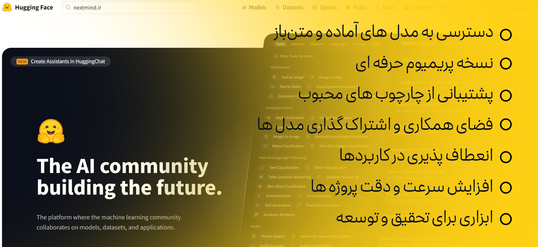 به نقل از سایت Hugging Face: The AI community building the future. «جامعه هوش مصنوعی که آینده را می سازد.»