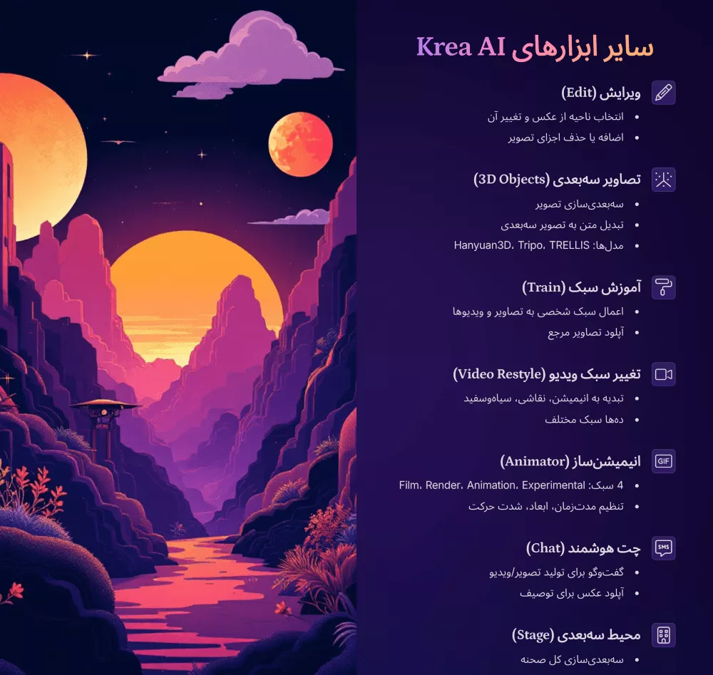 این هوش مصنوعی ابزارهای متفاوتی برای تولید و ویرایش تصویر و ویدیو دارد. با خرید اکانت krea ai بدون محدودیت به این ابزارها دسترسی پیدا میکنید.