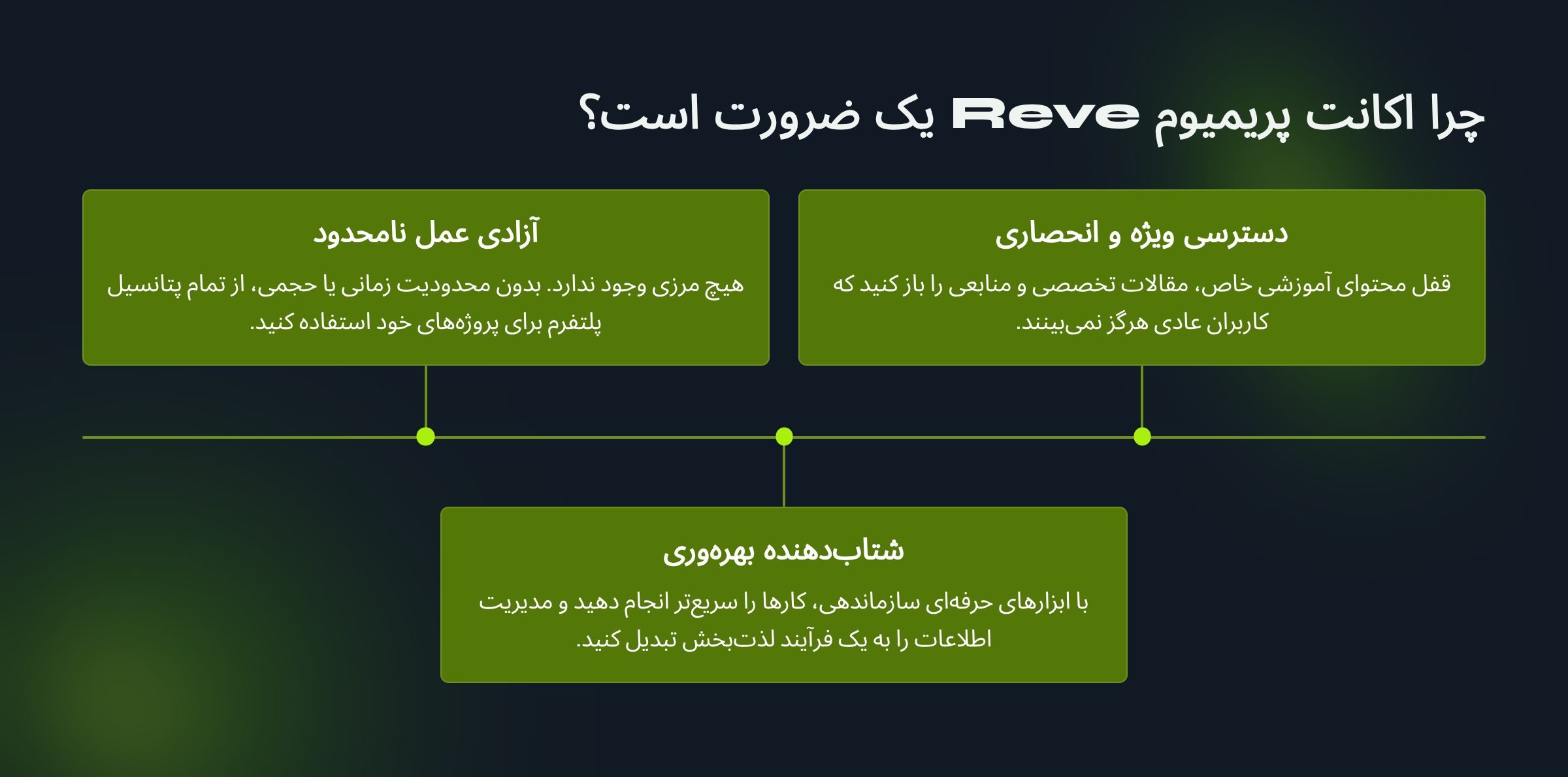 این اکانت پریمیوم به کاربران امکان دسترسی به محتوای انحصاری و ابزارهای حرفه ای را می دهد. با داشتن این اکانت، کاربران می توانند به منابع آموزشی و اطلاعاتی که برای کاربران عادی قابل دسترس نیست، دسترسی پیدا کنند، جستجو و مدیریت اطلاعات خود را سریع تر و آسان تر انجام دهند و با استفاده از ابزارهای سازماندهی و تحلیل حرفه ای، بهره وری خود را افزایش دهند. همچنین، اکانت Reve بدون محدودیت زمانی یا محدودیت استفاده، تجربه ای راحت و حرفه ای با رابط کاربری ساده و پشتیبانی آنلاین فراهم می کند و به کاربر امکان می دهد به بهترین شکل از امکانات پلتفرم بهره مند شود.