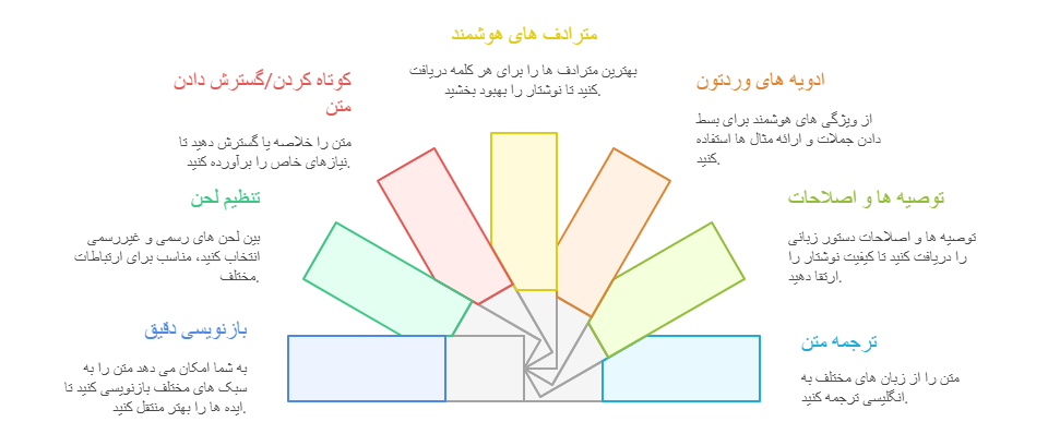 بازنویسی دقیق: به راحتی جملات، پاراگراف ها یا کل متن را به سبک های مختلف بازنویسی کنید تا ایده ها بهتر منتقل شود.