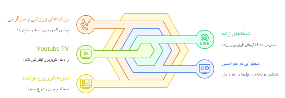 خرید اشتراک Youtube TV به شما امکان دسترسی به بیش از 100 شبکه تلویزیونی زنده از جمله ABC، ESPN، Disney Channel، Cartoon Network و بسیاری شبکه‌ های مشهور دیگر را می‌ دهد. این سرویس با ارائه فضای ذخیره‌ سازی نامحدود DVR، قابلیت تماشای آفلاین برنامه‌ ها، امکان اتصال به سه دستگاه هم‌ زمان و پشتیبانی از اکثر تلویزیون‌ ها، موبایل‌ ها و مرورگرها، یک تلویزیون اینترنتی کامل را جایگزین سرویس‌ های گران‌ قیمت کابلی می‌ کند. به کمک Youtube TV می‌ توانید برنامه‌ های ورزشی، فیلم و سریال، سرگرمی، اخبار و شبکه‌ های اسپانیایی و انگلیسی را بدون محدودیت دریافت کرده و تجربه‌ ای مدرن و لذت‌ بخش از تماشای تلویزیون داشته باشید.